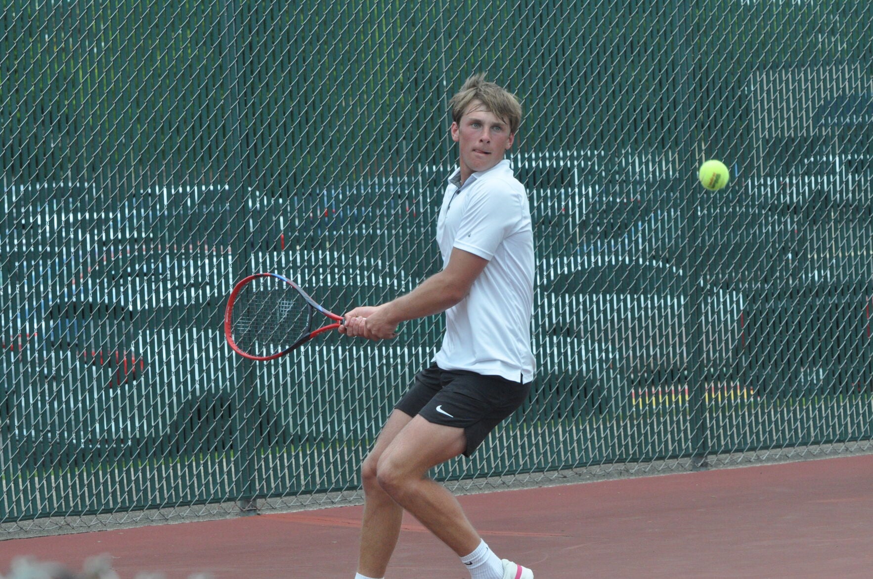 Badger freshman Ben Auguston hits a return shot in the number